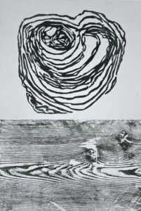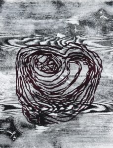 Woodcut, mixed media with photopolymer intaglio, 2025